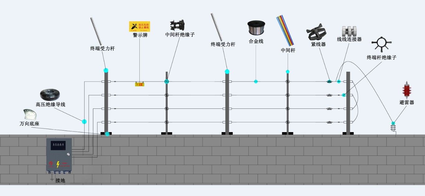 2、电子围栏的安装按其在现场的安装位置,分为独立式,附属式和墙顶式三种基本安装形式。
